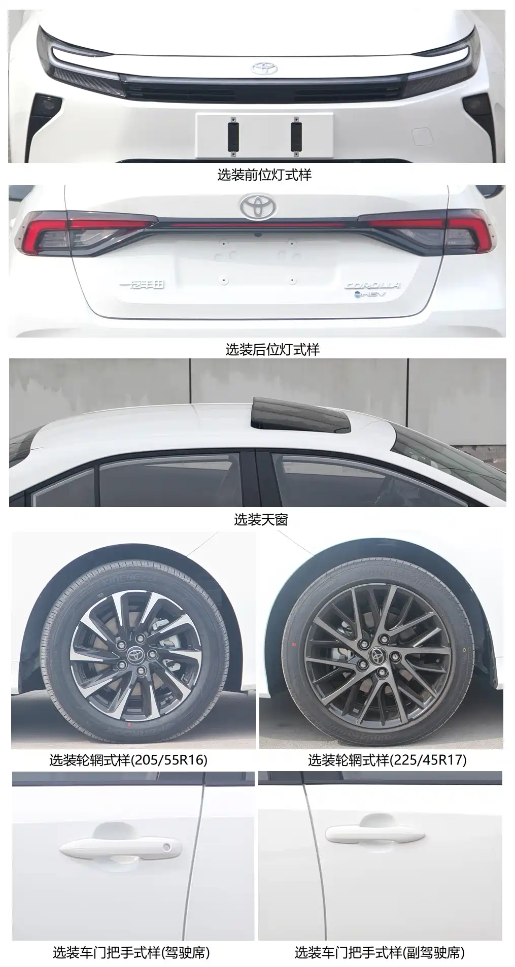 新款卡罗拉采用丰田最新家族化设计语言,前脸造型焕然一新。全新设计的灯组呈环形布局,与下部进气口巧妙融合,整体风格更加简洁流畅,带有浓厚的新能源车视觉元素,科技感明显提升。车尾部分变化不大,依旧采用贯穿式尾灯设计,并加入熏黑处理,增强时尚气息和辨识度。车身尺寸方面,长宽高分别为4710mm/1780mm/1435mm,轴距为2750mm(增加50mm),燃油版与双擎版保持一致。配置方面提供多种选装方案,包括不同样式的前后灯组、16或17英寸轮圈、车门把手、天窗等。