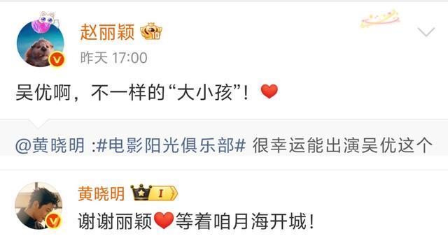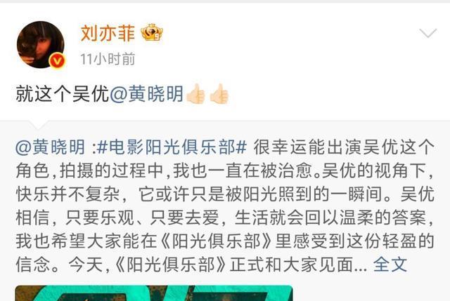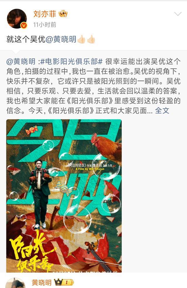 黄晓明领衔主演的电影《阳光俱乐部》经历撤档又定档后,这两天已经正式在院线上映了。十九年前曾合作过《神雕侠侣》的刘亦菲也帮忙转发宣传,黄晓明还是以“杨过”的口吻回复“谢谢姑姑”。