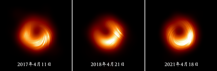 如图所揭示,M87黑洞附近的磁场分布,2017年由里向外呈逆时针方向,2018年与2017年基本一致,但2021年则反转成顺时针方向。